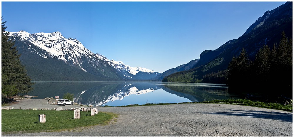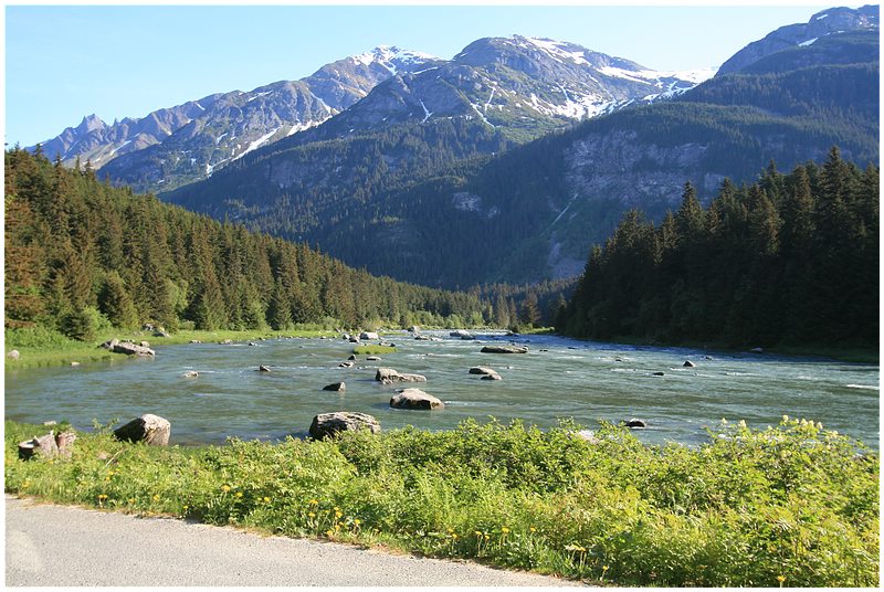 Diese Strecke ist eine der schönsten auf dieser Tour. Der Wechsel der Landschaften ist beeindruckend. Zuerst geht es den Chilkat River entlang, dann dem Klehini River bis zur Grenze von Kanada.