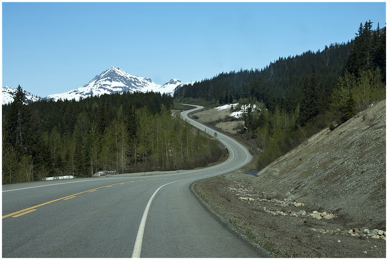 28.05.2010Wieder scheint die Sonne (10°C), als ich den CG verlasse. Erst geht es die gleiche Strecke zurück bis zum Hafen und dann weiter bis Haines.