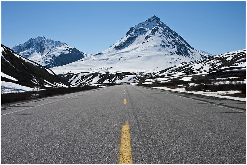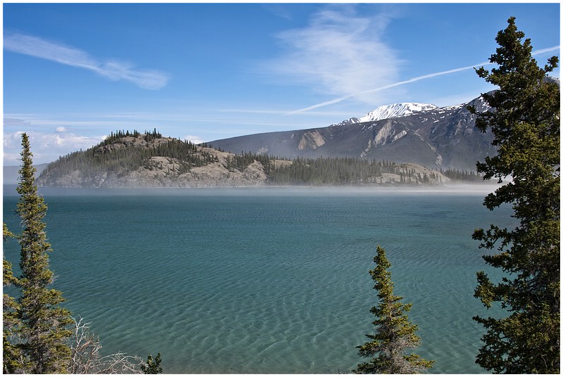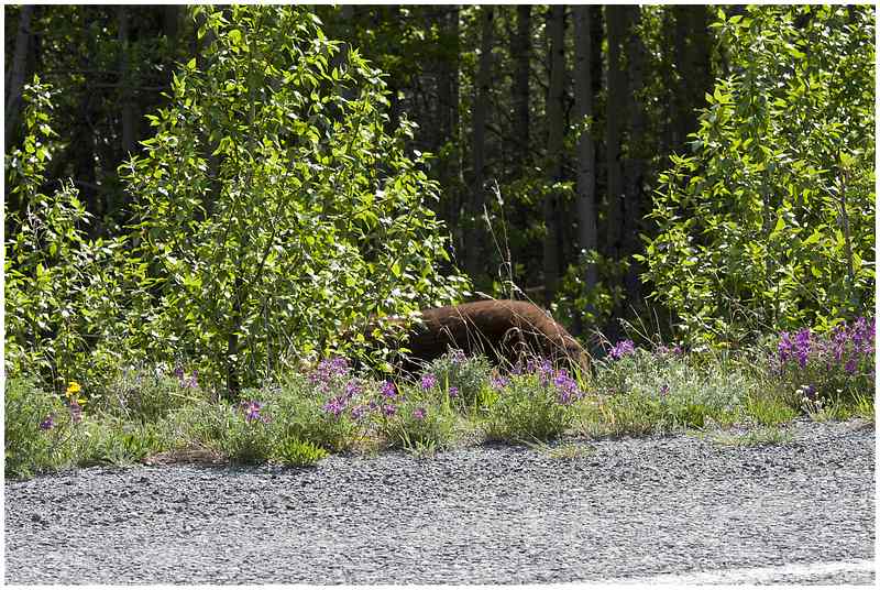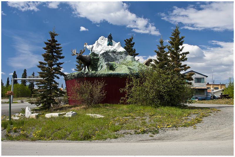 Wieder ist an der Grenzstation eine Dame im Einsatz. Hinter der Grenze bin ich wieder in Britisch Columbia und noch einigen Meilen wieder ein Bär am Strassenrand. Es geht berg an und die Baumgrenze ist erreicht. Links und rechts der Strasse liegt Schnee, als ich den Chilkat Pass mit seinen knapp 1000 Metern erreiche. Von BC geht es wieder nach Yukon hinein und gegen 13:00 Uhr bin ich in Haines Jct. Der Ort ist nicht besonderes, also nur Tanken, Wasser auffüllen und kurz ein Besuch im Visitor Center.