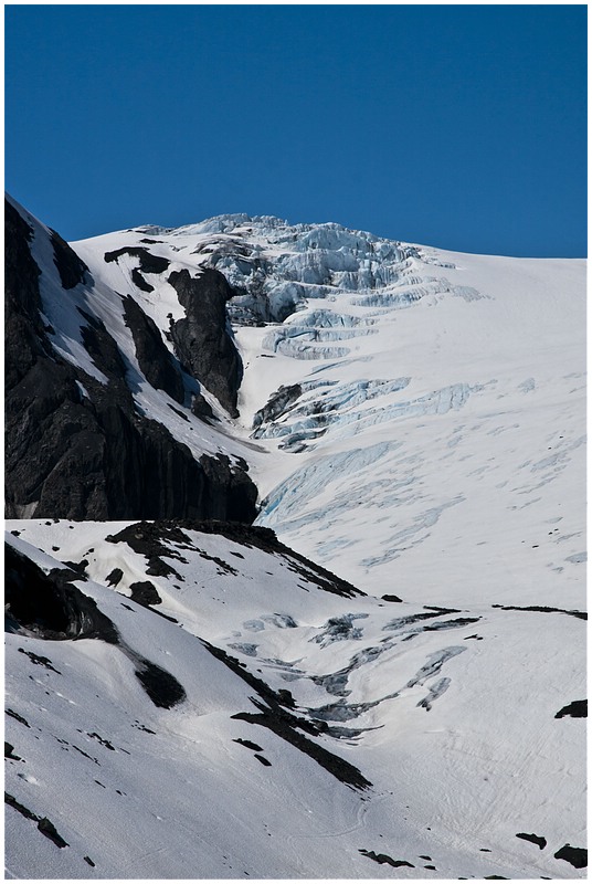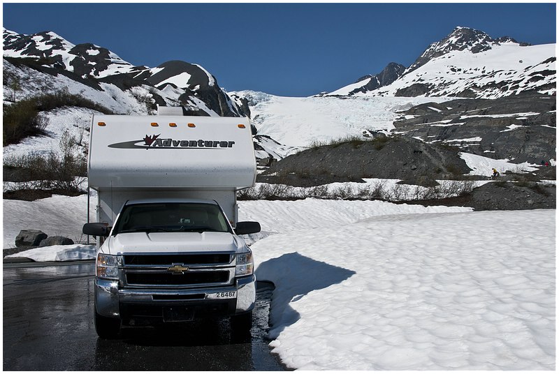 Um 10:00 starte ich, das Wetter ist klar bei 17°C. Hinter Gakona Jct wechsele ich auf den Richardson Hwy und steuere mein nächstes Ziel Valdez an. Eine etwas längere Pause lege ich am Willow Lake ein. Die Sicht ist klar und man kann in der Ferne die Wrangell Mt sehen. Zum ersten mal auf dieser Tour sehe ich auch bewusst die Trans-Alaska-Pipeline. Aus Wald wird Gebirge und ich komme in die Region der Gletscher vor Valdez. Am Worthington Glacier lege ich eine Pause ein, bevor es dann über den Thompson Pass (2678 ft.) berg ab an die Küste geht. Unterwegs gibt es noch zwei sehenswerte Wasserfälle, den Bridail Veil Falls und den Horsetail Falls.