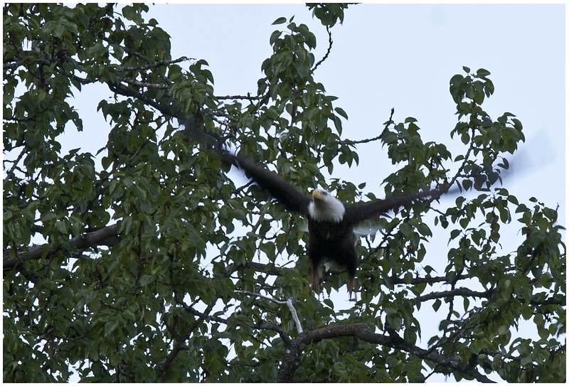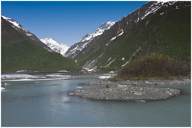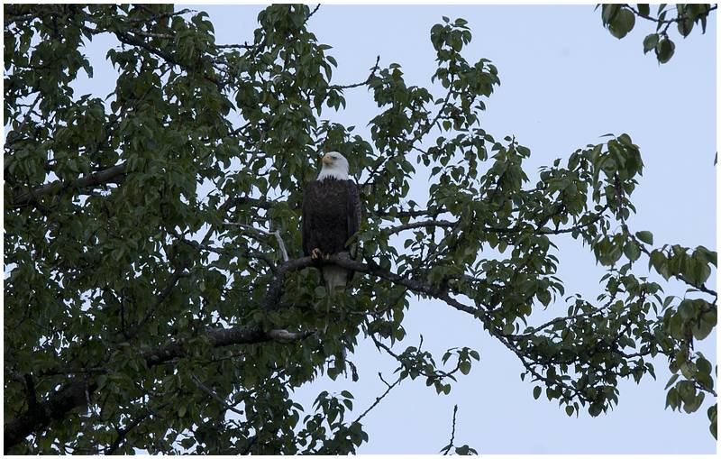 Nach dem ich mir noch etwas die Stadt angeschaut habe, fahre ich stadtauswärts zum Valdez Glacier. 1,5 Meilen vor dem Gletscher ist der Valdez Glacier CG. Hier reserviere ich mir einen Stellplatz, nicht weit von einem Wasserfall entfernt. Danach fahre ich zum Gletscher raus und laufe dort ein Stück am Wasser entlang. Wieder auf dem CG bemerke ich neben meinen Stellplatz im Baum ein Adlernest. Aus dem Nest kann man deutlich den Kopf eines Weißkopfadlers sehen. Mit dem CG Host komme ich ins Gespräch und er zeigt mir eine Stelle wo ich noch besser das Nest beobachten kann. Irgendwann kommt er noch einmal zu mir und berichtet, dass jetzt der zweite Adler am Nest sitzt. Mit Stativ und Tele mache ich auf den Weg um beide Adler abzulichten.