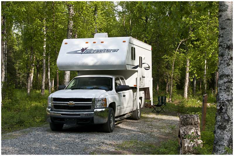 Elche und einen Adler. Ab Eureka Summit (3.322 ft) wird die Gegend wieder spannend. Vorbei geht es an Seen und Flüssen und im Hintergrund immer wieder Gletscher, wie zB den Matanuska Glacier. Den nächsten Ort den ich erreiche ist Palmer und ich sehe den ersten Mc Donald auf der Tour. Ich entschließe mich noch etwas zu fahren und hinter Wasilla (hier war Sarah Louise Palin Bürgermeisterin) werde ich einen CG suchen. Wasilla ist schon etwas größer mit seinen 6.700 Einwohnern. Etwas abseits der Stadt ist der Lake Lucille CG und den werde ich heute nutzen. Bezahlen ist nicht möglich es gibt keine Umschläge für die Registrierung. Nach Plan gibt es 59 Plätze, aber ich bin der einzige Besucher, wahrscheinlich ist der Platz noch gar nicht eröffnet.. Am späten Abend kommen noch zwei Fahrzeuge in das kleine Birkenwäldchen und das war es. Aber es wurde keine ruhige Nacht. Irgendwann werde ich wach und höre Bässe, die durch den Wald hallen. Um 02:00 immer noch dieses Gedröhne und dann ist Ruhe. Wahrscheinlich war ich zu dicht an einer Stadt.