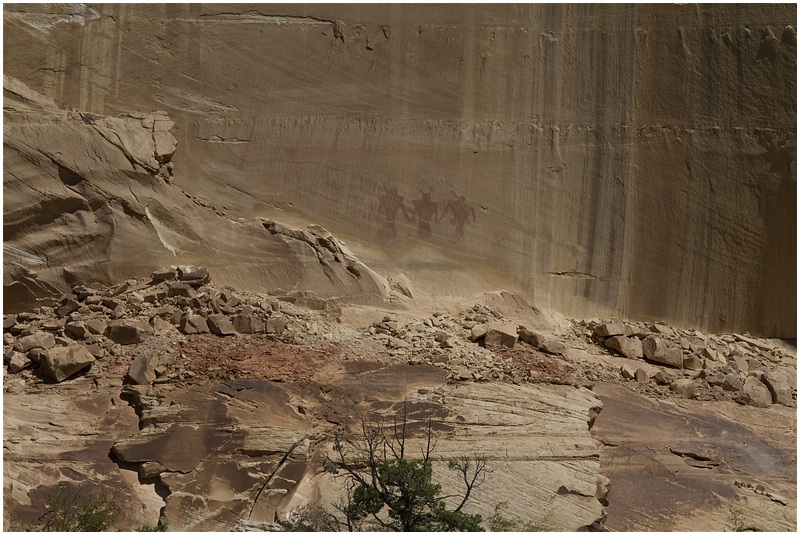 liegenden Canyonwand, große Felsmalereien sieht. Der Weg ist nicht