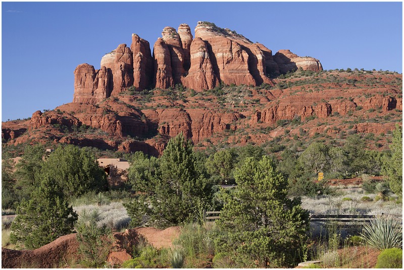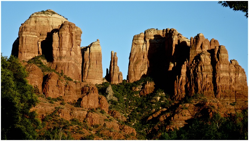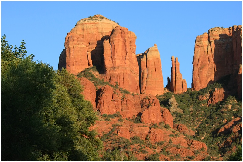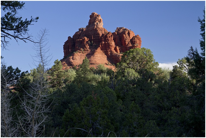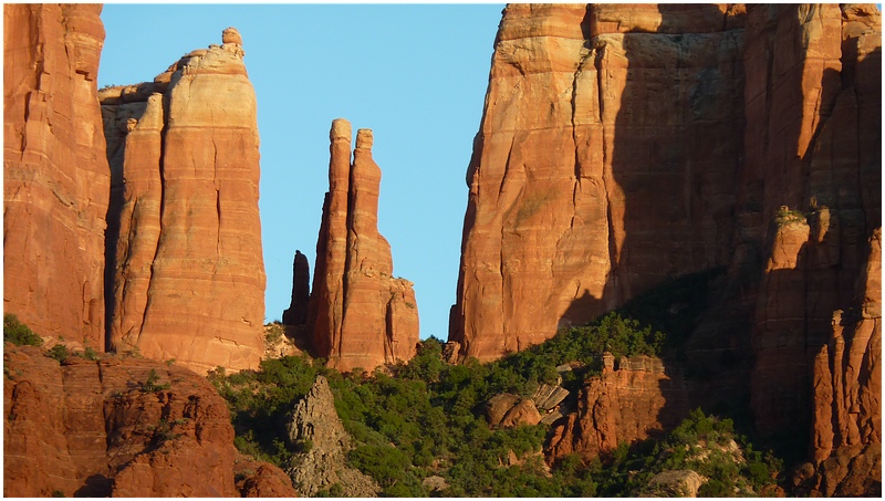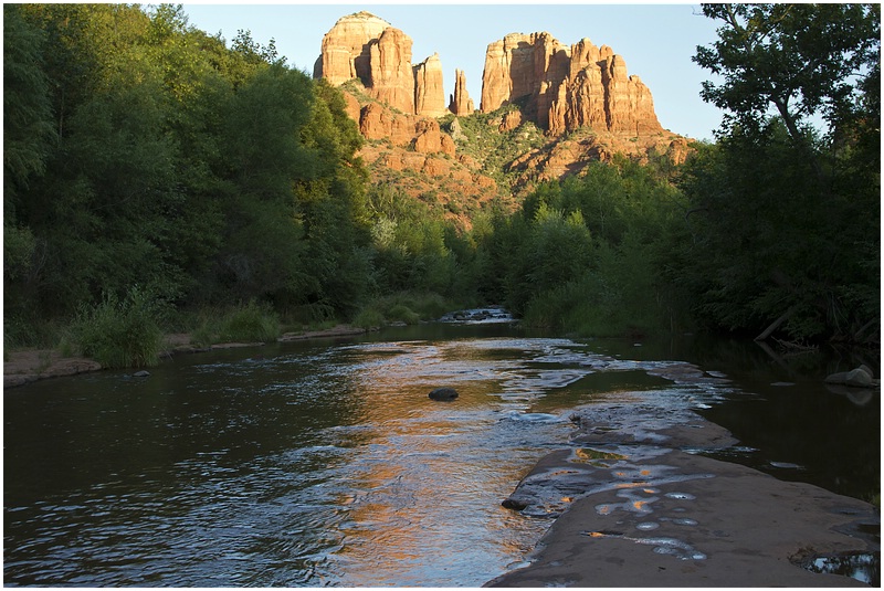 Nach dem im Hotel alles geregelt ist geht es noch zum Cathedral Rock. Über die 179 fahren wir nach Süden und in Big Park biegen wir nach Westen ab. Am Ende der Strasse lassen wir den Wagen stehen und gehen bis zum Oak Creek. Als erstes fallen uns die Leute auf, die hier zwischen den Steinen baden. Etwas weiter sehen wir dann den Cathedral Rock. Leider habe ich das Stativ im Auto gelassen und so ist es schwierig schöne Bilder vom Sonnenuntergang zu machen. Als die Sonne untergegangen ist, machen wir uns auf den Rückweg. Als wir das Auto erreichen ist es bereits dunkel.