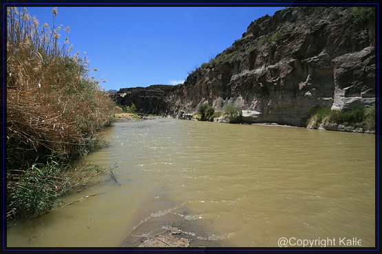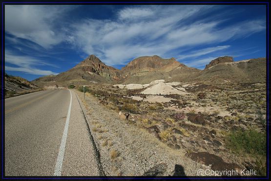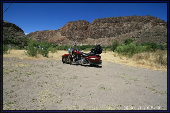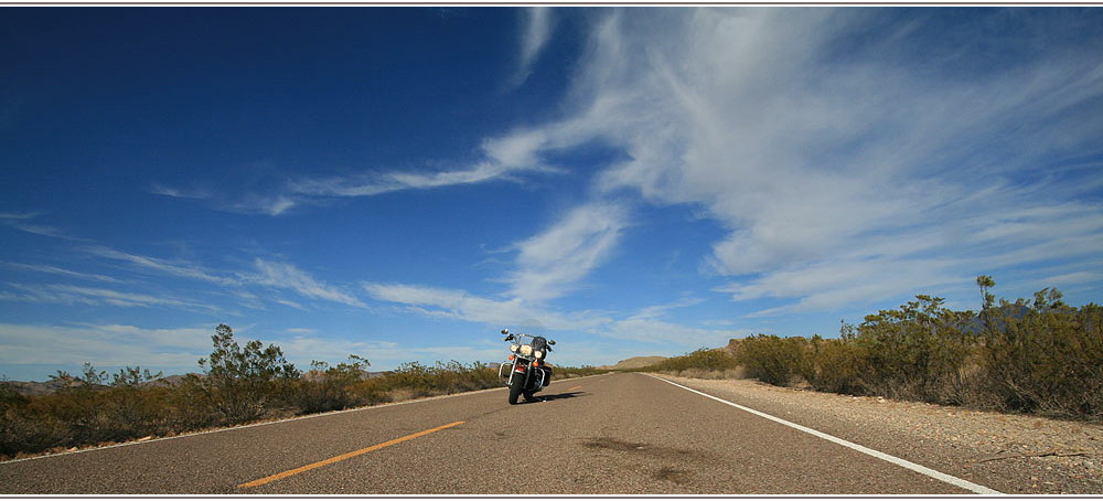 bekannt durch die Marfa-Lichter. Marfa. Ein kleiner Ort in West Texas, wo sich die Highways 90 und 67 kreuzen, 40 Meilen nördlich der mexikanischen Grenze … Eine baumlose Hochebene und ein weiter Himmel… Der Ort ist benannt nach einer Frauenfigur aus dem Roman «Die Brüder Karamasow» von Fjodor Dostojevski … James Dean drehte hier seinen letzten Film «Giant»… Das «El Paisano»-Hotel, wo Dean, Liz Taylor und Rock Hudson wohnten, steht heute noch… Die Coen Brothers filmten hier «No Country for Old Men». In den Hangars, wo während des Zweiten Weltkriegs deutsche Gefangene einquartiert wurden, stehen heute moderne Skulpturen. Klein wie er ist, hat der Ort doch eine aktive Kunstszene … Wenig ausserhalb des Orts hat ein Exzentriker die «Freie Republik Marfa» ausgerufen… Des Nachts kann man am Horizont Lichtkugeln auftauchen sehen, die «Marfa Lights», für die es keine Erklärung gibt - manche sagen, es seien die Seelen toter Indianerhäuptlinge, andere behaupten, es handle sich um Luftspiegelungen von Autoscheinwerfern … Vielleicht von dem Auto, mit dem James Dean nach Westen und in den Tod fuhr. Wir tanken noch einmal die Maschinen auf bevor es weiter geht zum Big Bend. Beim Tanken gibt es eine kleine Panne. Als Herbie mit dem Vorderrad über einen Deckel, der im Boden eingelassen ist, fährt, schlägt dieser um und das Vorderrad sitzt fest. Zum Glück ist er nur gerollt, bei schnellerer Fahrt hätte das böse enden können. In Presido stoppen wir noch einmal um einzukaufen, dann geht die Fahrt weiter. Hinter Presido fahren wir von der Straße ab und über eine Schotterpiste geht es bis zum Rio Grande. Der Rio Grande bildet hier die Grenze zwischen Mexiko und USA. Unten am Fluss beobachten wir Angler, die ziemlich große Fische aus dem Wasser ziehen. Bei der Abfahrt sackt mein Hinterrad im Sand ein und ohne fremde Hilfe wäre ich hier nicht mehr heraus gekommen. Nun sind es nur noch ein paar Meilen bis Terlingua. Wir beziehen unser Hotel und fahren danach in den Big Bend NP hinein. Hier geht es über Straßen, die für Bikes geschaffen sind durch den NP. Viele Kurven, auf und ab und eine herrliche Landschaft, so geht es bis zum Rio Grande. Bevor die Sonne untergeht verlassen wir den NP und fahren zurück zum Hotel.