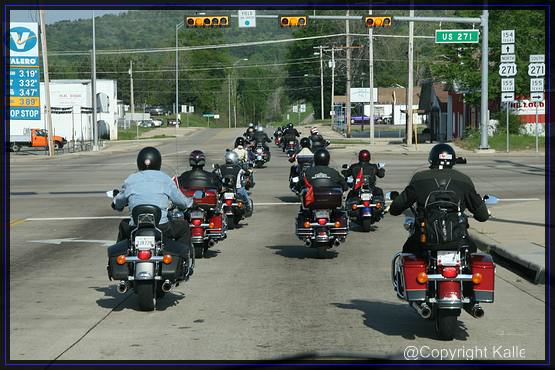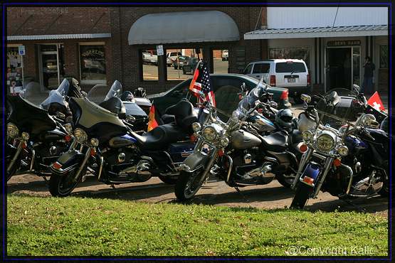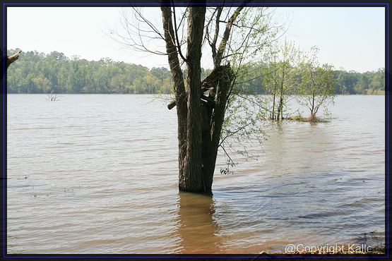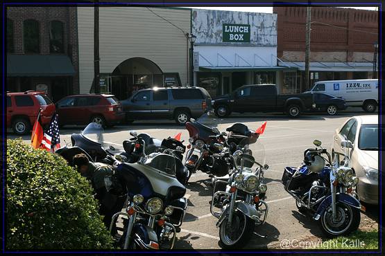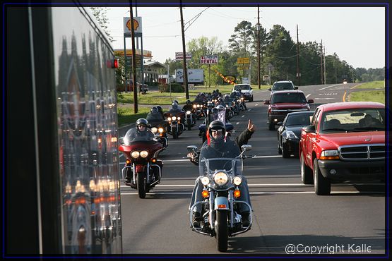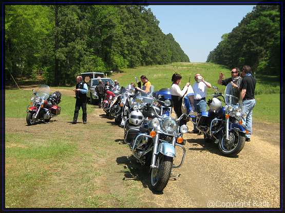 3. Tag, 07.04.2008Um 06:00 stehe ich auf, frühstücke und packe meine Sachen. 08:00 ist Treffen bei den Bikes, Hans erzählt etwas über die heutige Strecke und danach starten wir den zweiten Fahrtag. Wir fahren über Tatum nach Carthage und machen mitten im Ort eine Pause. Das Zentrum des Ortes ist ein kleiner Platz, der wie ein Park angelegt. Die vielen Motorräder erregen sofort Aufsehen und nach ein paar Minuten sind drei junge Frauen der örtlichen Presse bei uns. Es werden die üblichen Fragen gestellt und wir sollen uns für ein Foto, dass am nächsten Tag in der Zeitung erscheinen wird, fotografieren lassen. Den Gefallen machen wir den Damen gerne und zum Schluss möchte noch ein älteres Ehepaar mit auf das Bild. In Carthage kaufen wir noch Lebensmittel für ein Picknick ein und fahren weiter über Tenaha, Logansport und Stanley. Jetzt sind wir in Louisiana und hier ist auch wieder Helmpflicht. Die Fahrt geht entlang dem Toledo-Bend-Reservoir, eine wie ich finde, landschaftlich sehr schöne Strecke. Wir verlassen die Strasse, fahren durch einen kleinen Wald und sind dann unten am See. Hier stehen alles nur kleine Häuser mit Wassergrundstücken und Bootsanleger. Eine alte Dame fragen wir, ob wir hier picknicken dürfen. Sie sagt, das Grundstück gehört ihrem Nachbar und der ist nicht da. Aber sie und er hätten nichts dagegen, wenn wir keinen Müll dort lassen. Also lassen wir uns dort nieder und genießen den See und die Landschaft. Irgendwann kommt die Dame mit anderen Nachbarn wieder zurück und so lernen wir fast die ganzen Anwohner kennen. Als wir den Platz verlassen stehen alle am Straßenrand und winken uns zu.