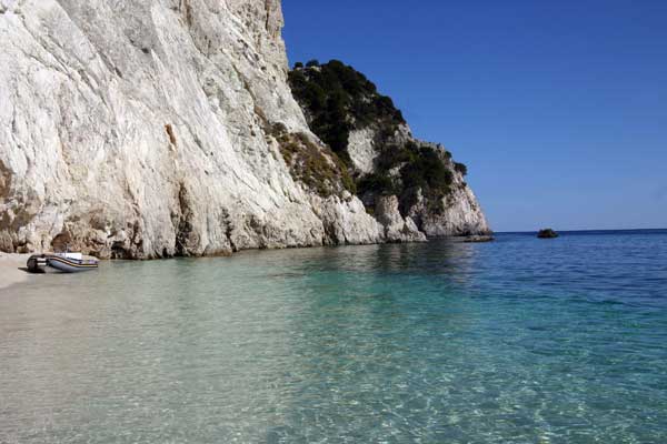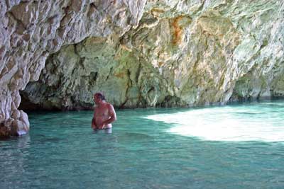 die Weiterfahrt. Wir steuerten nun die Insel Marathonissi an, die Schildkröten-Insel. Diese Insel hat die Form einer Schildkröte und dient auch Nistplatz der Caretta. An der östlichen Seite legten wir dann eine Pause ein und genossen den fast tropisch anmutenden Strand. |